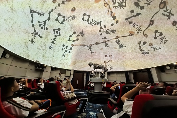 在航海数字天象馆,翁建军老师为师生们介绍了航海导航技术的发展。他悉心讲解天文航海中常用到的星座和天文导航原理,演示了六分仪的使用方法。员工们仰望模拟的浩瀚宇宙,直观地学习了星座知识和天文现象。