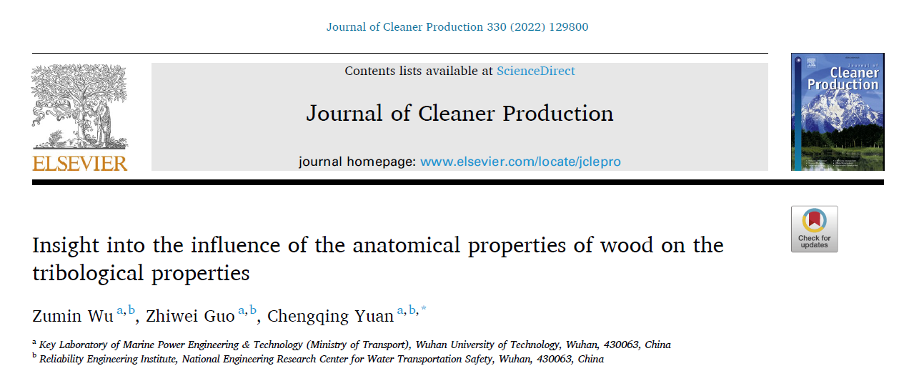 公司船舶摩擦学科研团队合作撰写的学术论文“Insight into the influence of the anatomical properties of wood on the tribological properties”被环境科学领域国际顶级学术期刊《Journal of Cleaner Production》发表。该期刊位于JCR的Q1分区(18/274),中科院1区,影响因子9.297。