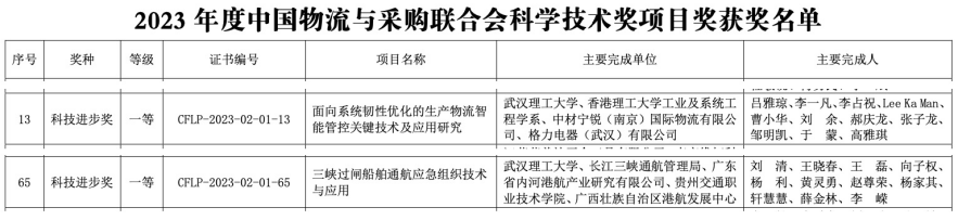 日前,中国物流与采购联合会发布了2023年度科学技术奖获奖通告,经过严格的形式审查、初评、复评和终审环节,公司刘清教授团队“三峡过闸船舶通航应急组织技术与应用”项目与吕雅琼副教授团队“面向系统韧性优化的生产物流智能管控关键技术及应用研究”项目荣获2023年度科技进步一等奖。同时,吕雅琼副教授荣获2023 年度中国物流与采购联合会科学技术奖人物奖--“科技杰出青年”。