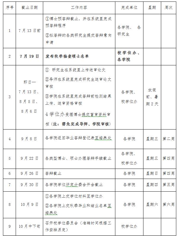 各类研究生答辩表决票盖章办理截止日期为2021年9月22日,答辩截止日期为2021年9月26日。各学位评定分委员会开会截止日期为2021年9月30日,各公司报送学位材料及秋季毕业、结业名单截止日期为2021年10月9日,其中秋季毕业、结业名单报送至培养处。