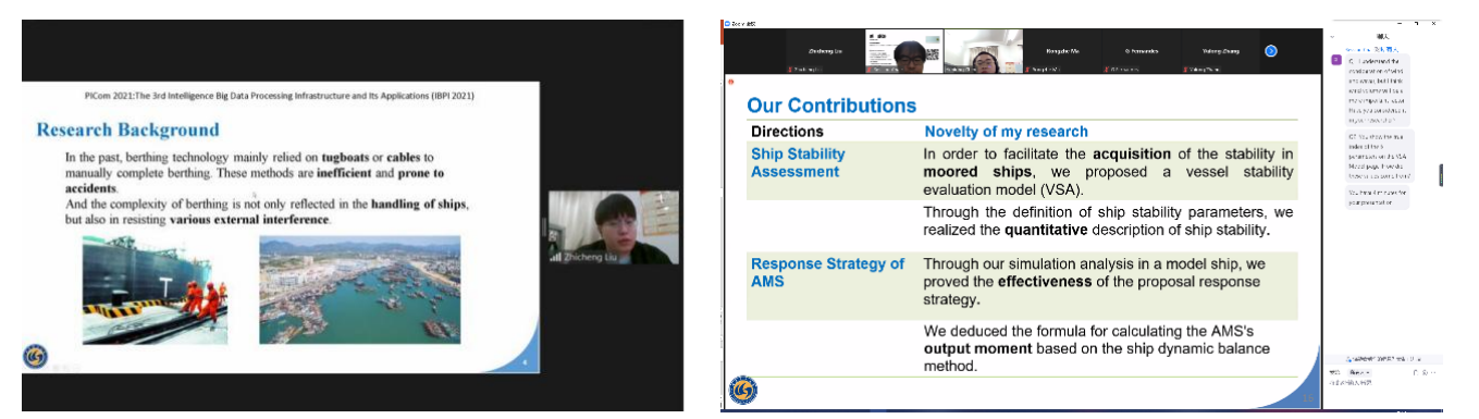 2021年10月28日,公司IROS实验室的两名硕士研究生刘志诚、陈昀龙参加了国际学术交流会议:PICom 2021(The 3rd Intelligence Big Data Processing Infrastructure and Its Applications (IBPI 2021) ),并分别就自动靠泊和自动系泊方向的创新研究做了学术汇报。