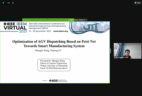 2021年12月15日,公司吕雅琼副教授课题组研究生向尚佳参加国际学术交流会议:工业工程与工程管理国际学术会议IEEE International Conference on Industrial Engineering and Engineering Management 2021(IEEM 2021),在“Systems Modeling and Simulation 1”分论坛针对AGV调度问题的创新研究做了学术汇报。
